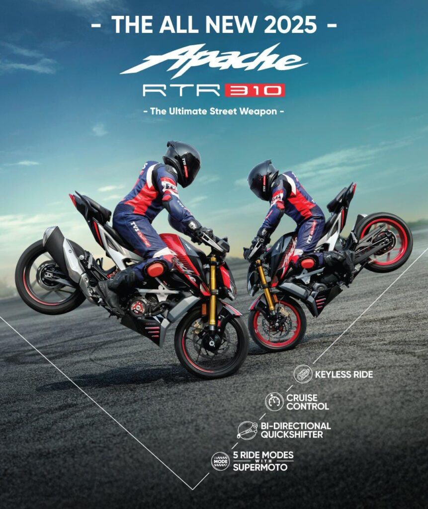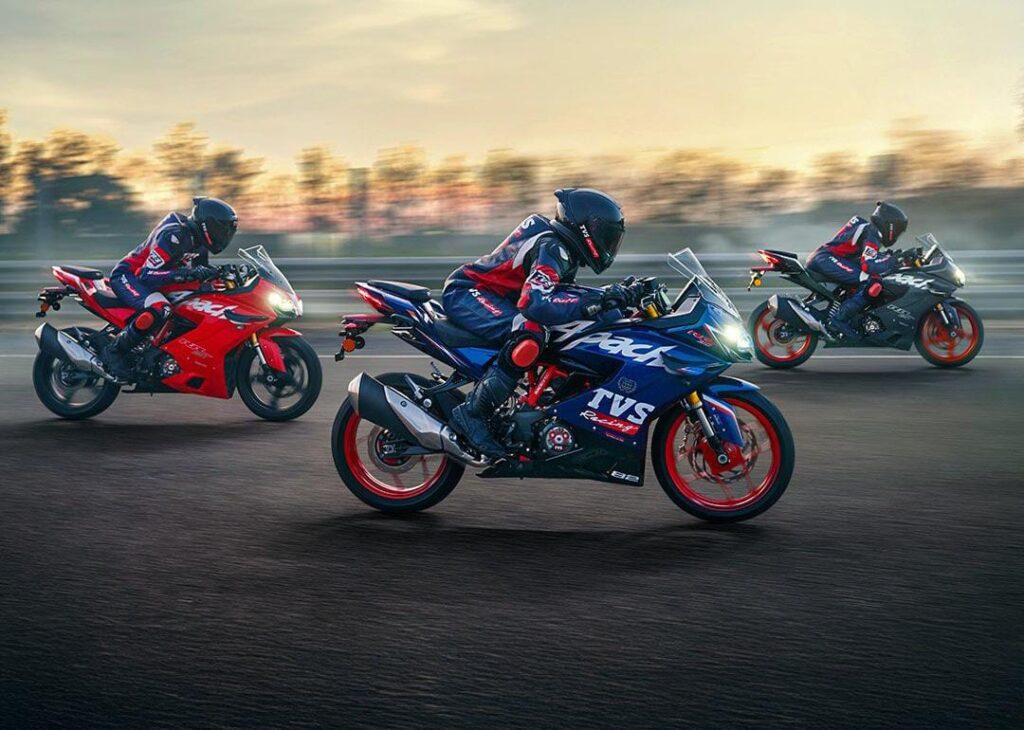 Apache RTR 310: यह TVS की फुल-फेयर्ड स्पोर्टबाइक है। इसमें 312.2 सीसी, सिंगल-सिलेंडर, लिक्विड-कूल्ड इंजन है जो ज़बरदस्त पावर और टॉर्क देता है। इसमें राइड मोड, एक फुल TFT डिस्प्ले, कुछ वेरिएंट में क्विक शिफ्टर और कई वैकल्पिक परफॉर्मेंस/इलेक्ट्रॉनिक किट शामिल हैं।